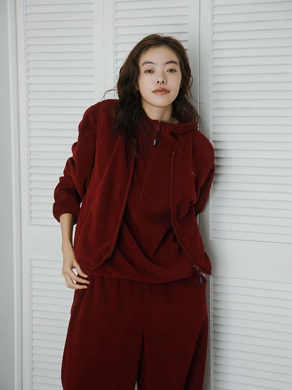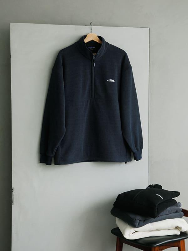 ハーフジップは一枚着でもレイヤードでも楽しむことができ、同素材のパンツと合わせたセットアップスタイルもおすすめ。