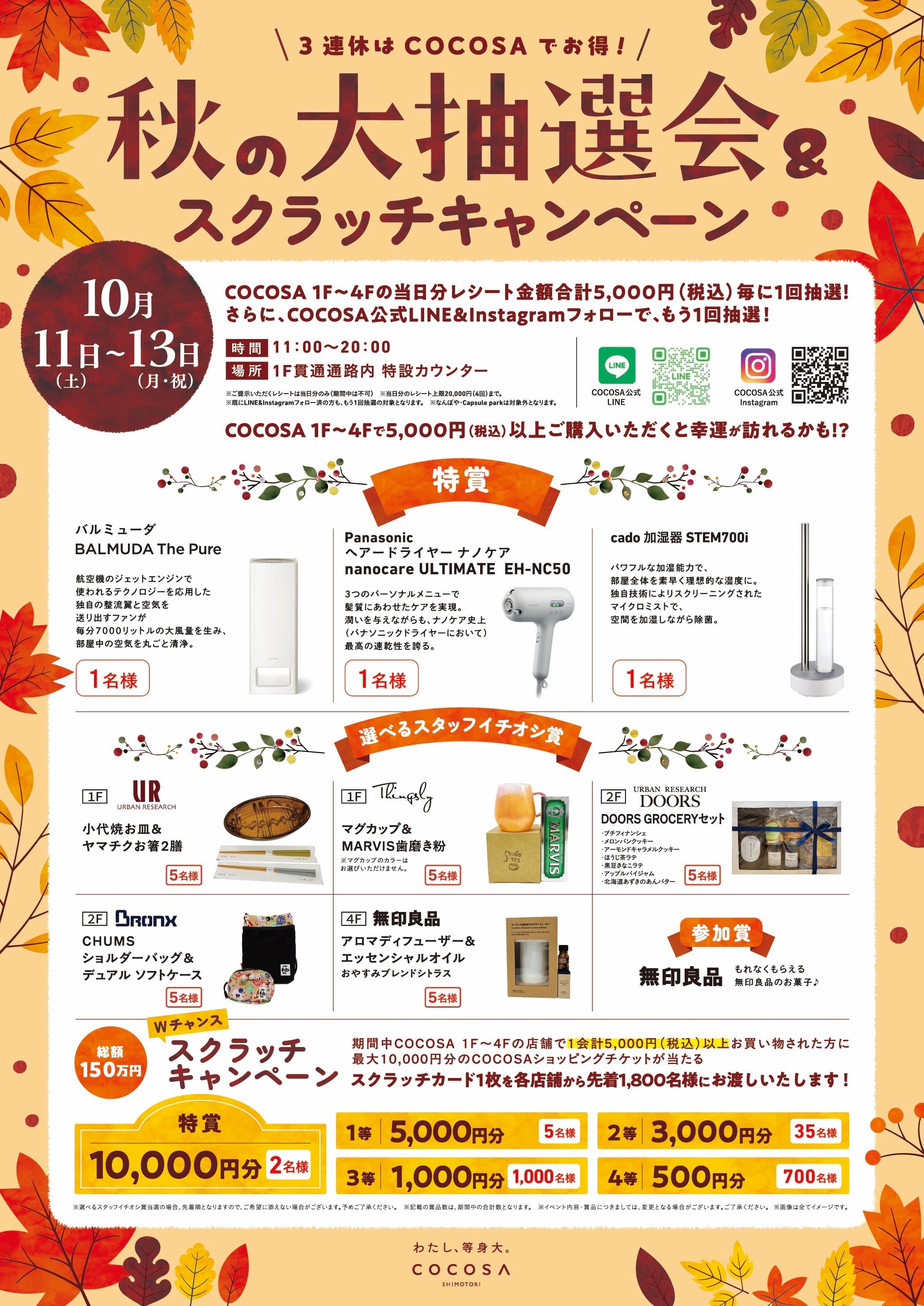 【予告】10月11日(土)~ 10月13日(月・祝)秋の大抽選会&スクラッチキャンペーン