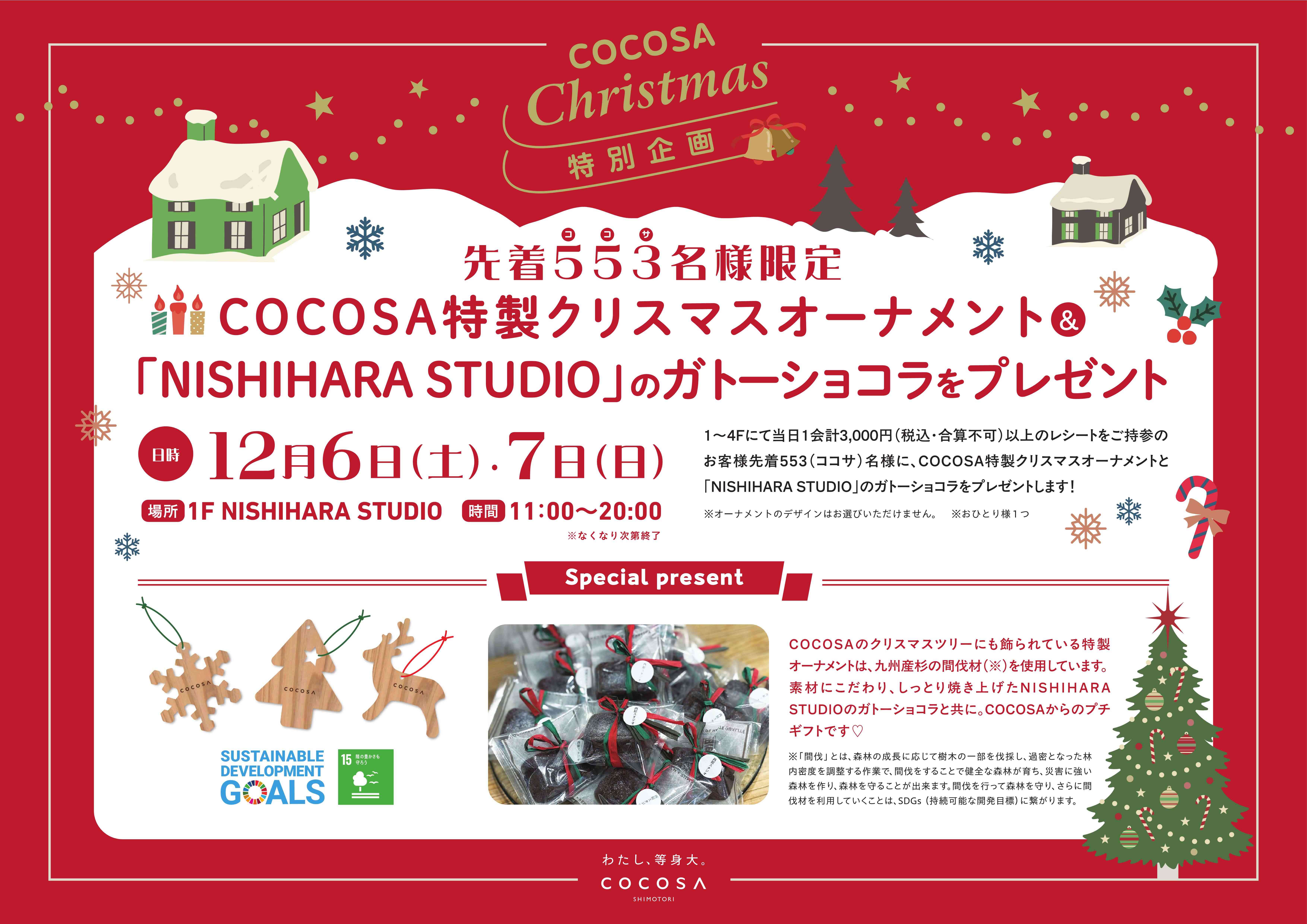 COCOSA特製クリスマスオーナメント&「NISHIHARA STUDIO」のガトーショコラを先着553名様にプレゼント!