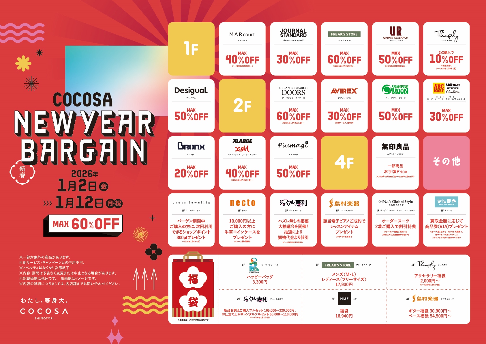 2026年1月2日(金)~「COCOSA NEW YEAR BARGAIN」開催!最大60%OFF・20店舗参加!