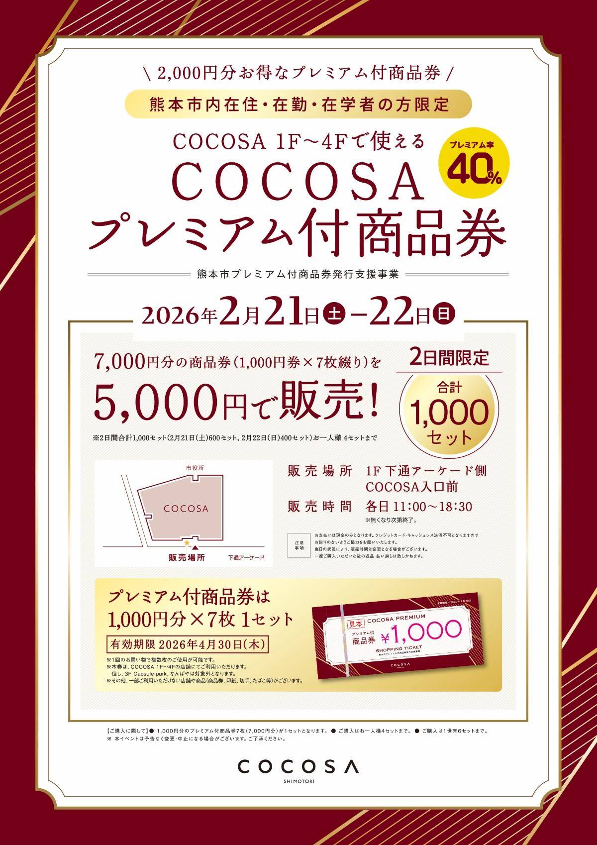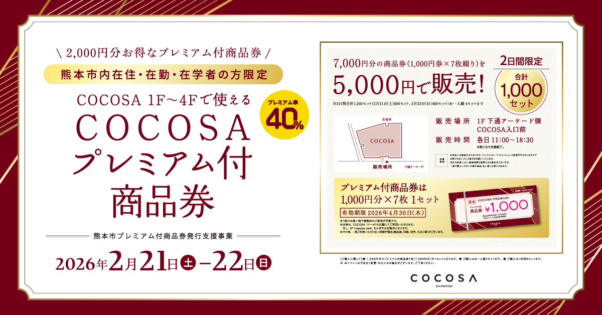 熊本市内在住・在勤・在学者の方へ、COCOSA 1階~4階でご利用可能なCOCOSAプレミアム付商品券を販売いたします!